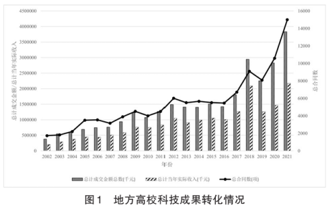 2.地方高校科技成果总量连续增长。地方高校推进科技成果转化股权化改革,既深化了科技成果完成人对企业经营管理和技术服务的参与,又提升了科技成果转化效果。如图1所示,2002—2021年间,地方高校科技转让合同持续增长,2021年合同项数相比2002年增加13261项,年均增长率达12.03%,展现了显著成效。