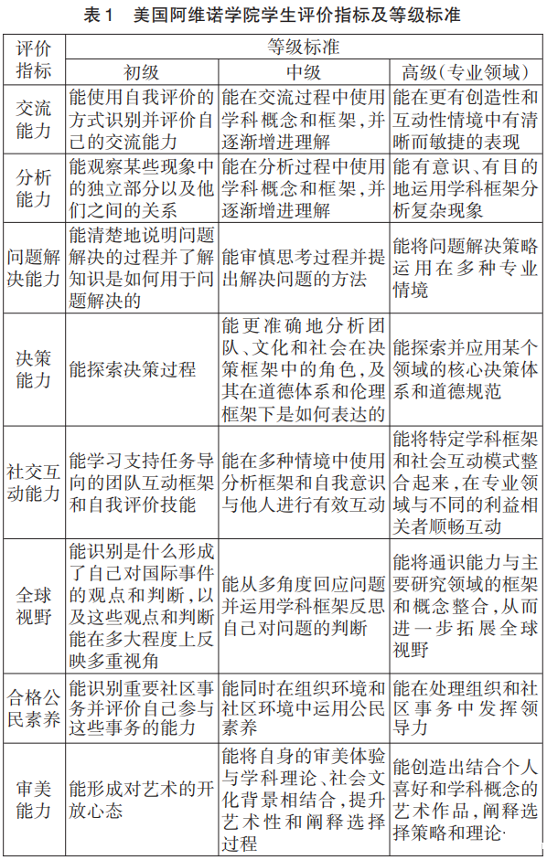美国高校的育人目标一般都由一系列核心能力构成,如沟通交流、团队合作、问题解决、批判性思维等。依据育人目标设计的评价指标包括两个方面:一是围绕核心能力确定评价内容;二是围绕评价内容确定等级标准,标准标识了期待能力的达到程度,能够有效向学生传达高校对他们的期待和要求,是一种提升评价有效度的方式。以美国一流文科大学阿维诺学院为例,该学校明确其育人目标是培养学生的交流能力、分析能力、问题解决能力、决策能力、社交互动能力、全球视野、合格公民素养、审美能力等八项核心能力,学校以这八项能力作为评价指标,从初级、中级、高级三个等级描述了各项能力应该达到的标准,形成了评价指标及等级标准体系,(见表1)其中评价指标是学生完成学业需要具备的核心能力;等级标准是区分学生表现的依据。从对知识学习的要求看,初级标准主要关注学生对知识的呈现、观察、识别、说明,中级标准关注学生对知识的思考、分析、理解,高级标准关注学生对知识的应用、运用、创造。在课程和专业学习之前,教师向学生说明评价指标和等级标准,希望学生能够以达到高一级水平的标准为目标。育人目标和评价指标的一致性为评价赋能育人提供了前提条件,用与育人目标一致的指标开展的评价,其结果最终指向育人目标的达成与育人成效的提升。